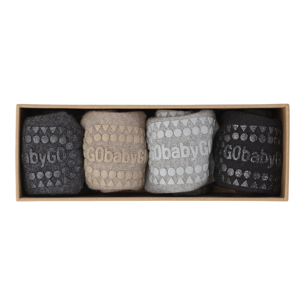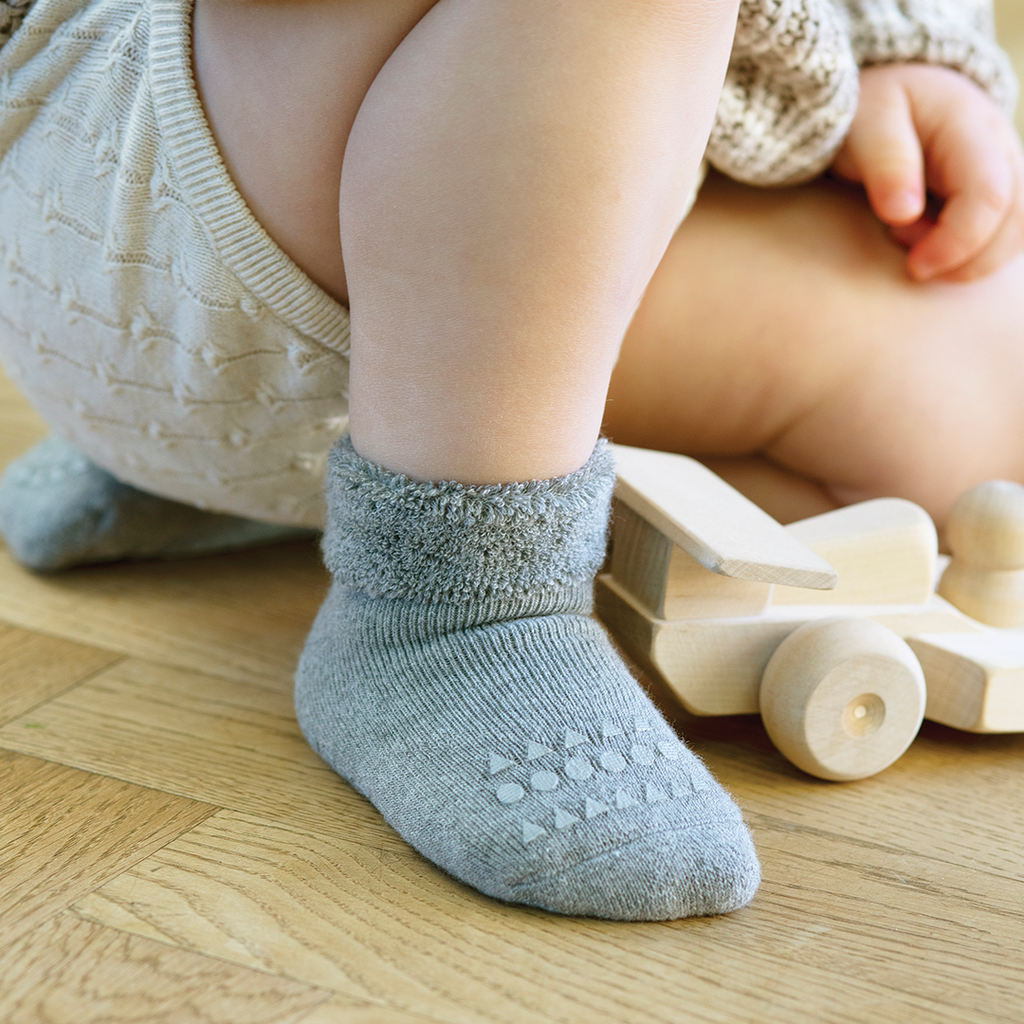 Box of 4 non-slip grip socks in organic terry cotton. The grip socks feature specially designed non-slip grip soles and rubber pads on the toes, making them perfect for babies and toddlers who love to crawl, walk, and run without slipping. The grip socks support your child's motor skills, balance, and confidence. Made of thick, organic and breathable cotton making them suitable as an alternative to slippers. Slippers with a hard sole can hinder the development of small feet, so we recommend using grip socks to allow little feet to develop and grow correctly.